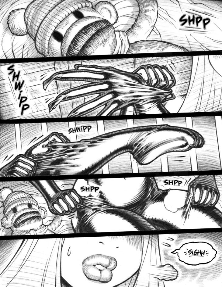 Panel 1: Emp's long-lasting childhood stuffed animal Mellow Mr. Monkey returns!
