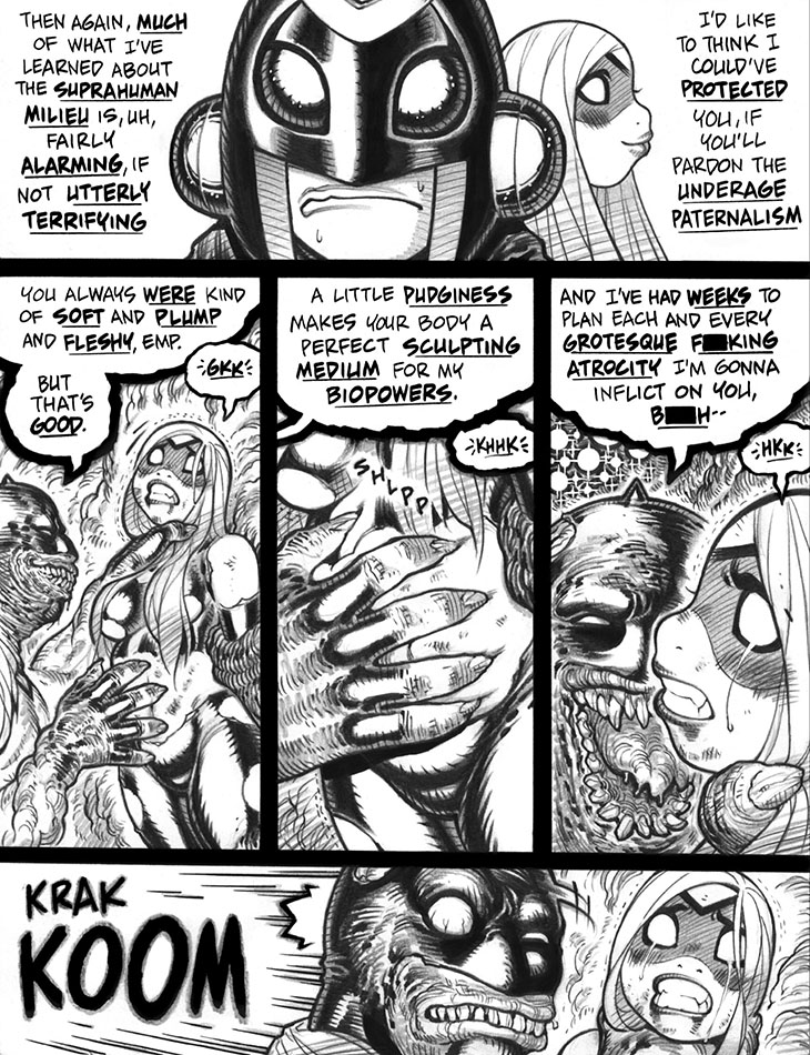 Panel 4: "Weeks" is yet another reminder that very little "real time" elapses over the course of this series, with the apex arguably being Empowered vol. 11, which takes place during maaaaybe 30 minutes of mostly nonstop mayhem.