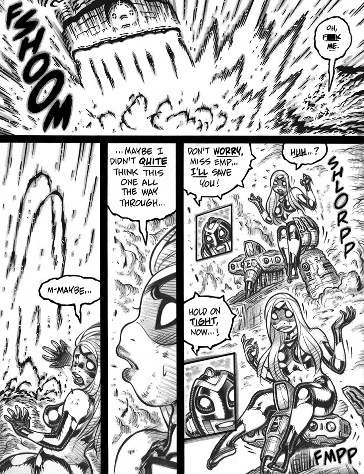 Panel 4: Only now did I notice that both the Alien War Machine and the Manny Mecha sport a similar "hammerhead" design riff, which I must admit is a long-time personal fave. (See the SimHell redesign of the Dirty Pair's Lovely Angel starship for another example.)