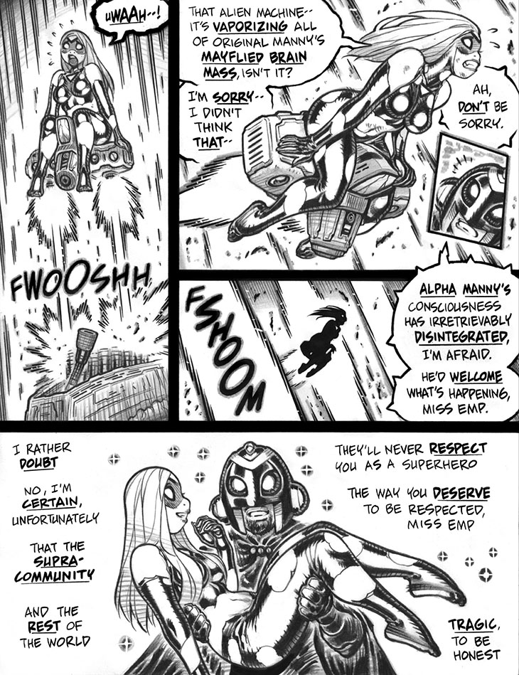 Technically, Emp could've asked the Manny Mecha to open another escape portal at their current location, but as you'll see, she has a reason to return to the existing Lotus Node anchor site—though it only now occurs to me that they're not all that far from where the scene started. Wellp, maybe the "megatons of hybridized cancerflesh" have rippled and undulated 'em a greater distance from that location; or, more to the point, I crammed slightly too much dialogue betwixt Emp and Mecha Manny into a brief flight that would've taken ten or fifteen seconds, tops. (Ehh, no biggeh.)
