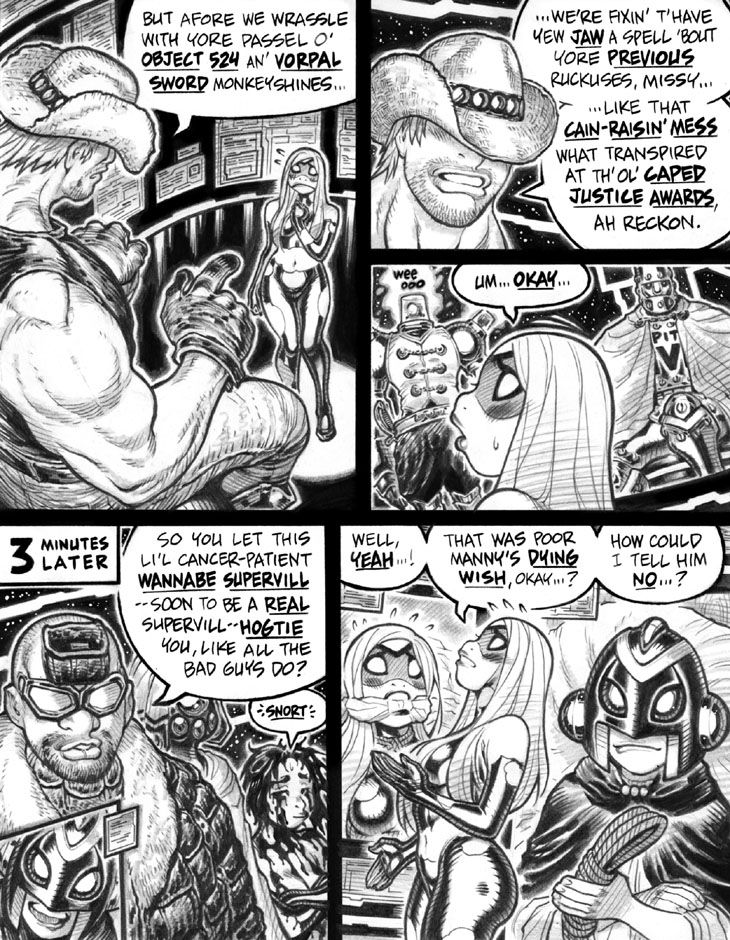 Note that Country Strong's distinctive speech patterns are derived from a whole passel o' Old West cowboy linguistic lists I scavenged online, just 'cause I found the concept amusing; no doubt some readers will find this annoying after a while but, well, you're gonna have to deal with it. (At least you won't get the mangled-French onslaught of Le Chevalier Blanc until vol. 10.)