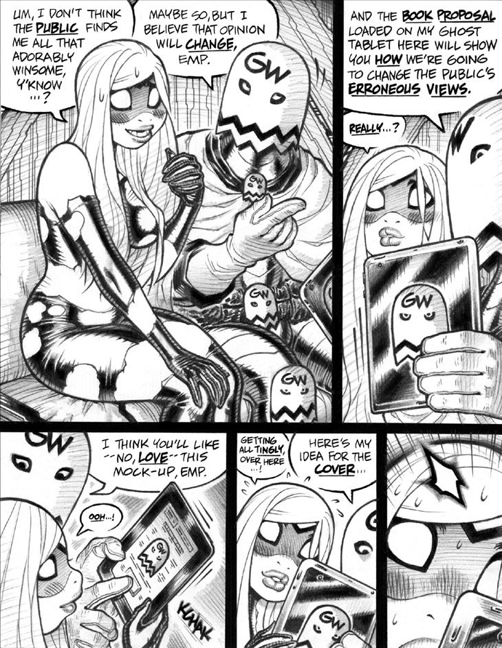 Panel 1: Re: the ghost symbols on Ghost writer's belt and knees, I'd like to think that his costume was worked up by the same in-universe designer who created Jade Jackyl's not dissimilar outfit.