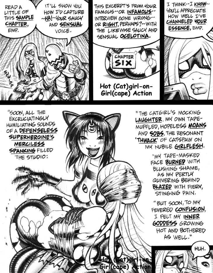 Panel 4: Almost a decade after publication (ouch), I was startled to finally notice the hitherto unnoticed production error of that "Hot (Cat)girl-on-Girl(cape)" type from panel 2 accidentally being replicated at the bottom of this panel. Whoops!