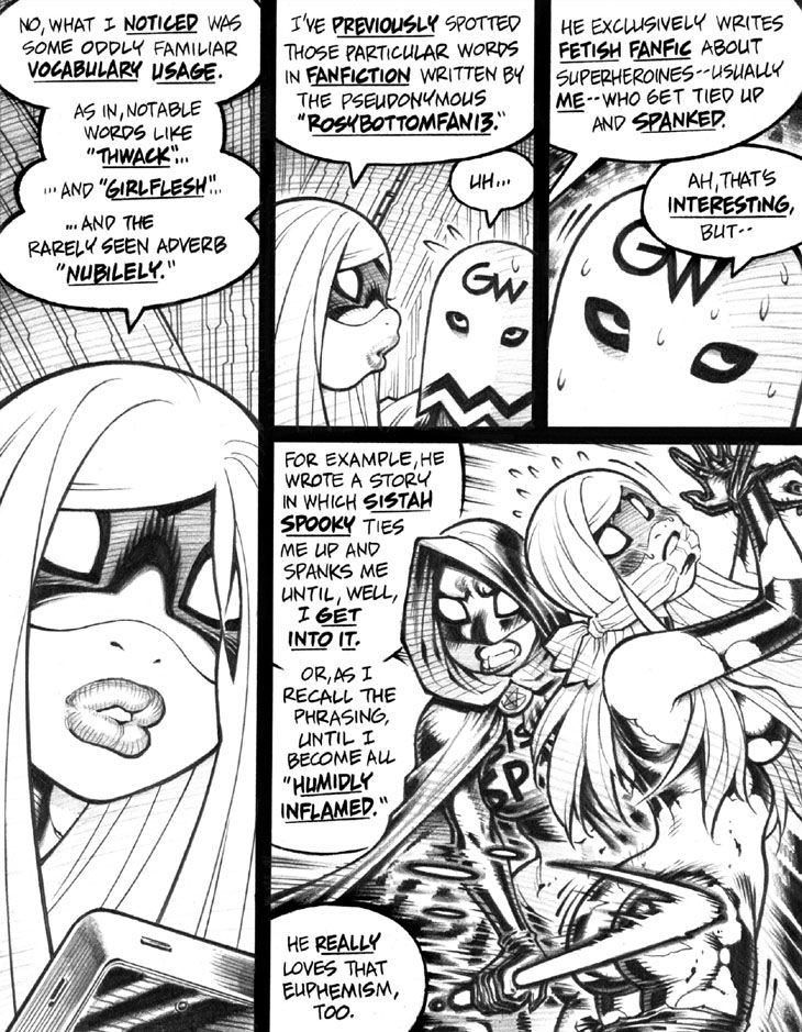 Panel 4: Emp is referring to a fanfic that was directly depicted back in Empowered vol. 1, but due to maddening DSL issues, I have neither the time nor the patience to link to that specific chapter, alas.
