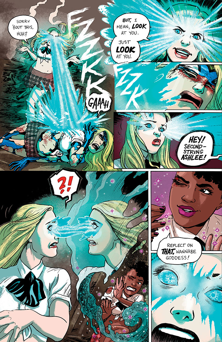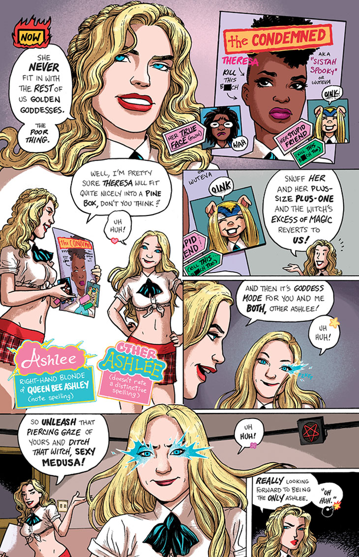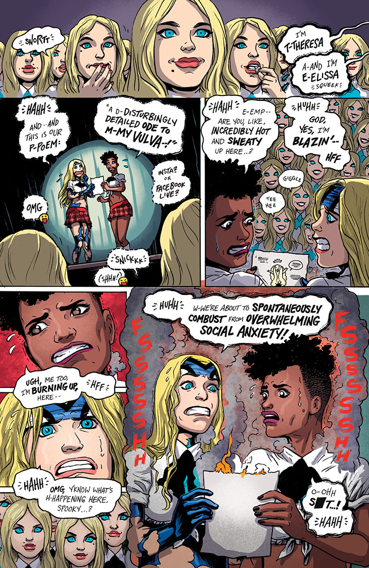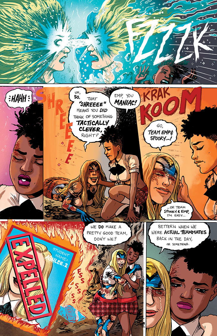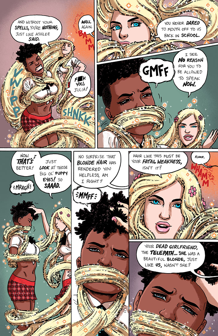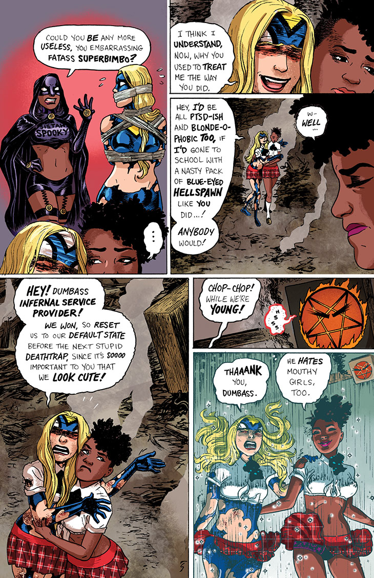 We continue serialization of the collected edition of the six-issue 2018 miniseries Empowered and Sistah Spooky’s High School Hell, written and laid out by me and featuring art and lettering by Guest Artist Carla “Speed” McNeil and coloring by Jenn Manley Lee.