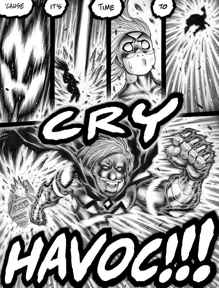 Note the white linework in Emp & Hubby Havoc's hair, which was added as black linework on an overlay, inverted to white in Photoshop afterward; this was done in imitation of the digital approach of just switching one's brush color over to white and scribbling on another layer, which for my money might legitimately be the best single thing about working digitally.
