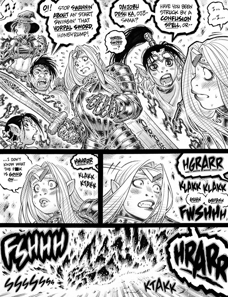 Note that the unusual lettering trick of having word balloons extending off-panel and hence being only partially readable at most is a riff dating as far back as Empowered vol. 2's climactic hospital scene. The idea is that the fact of the characters speaking is more important to the storytelling than what they're actually saying; as much as I like doing this on occasion, this is a much bigger "ask" when dealing with third-party letterers who have never, ever addressed such a concept before.